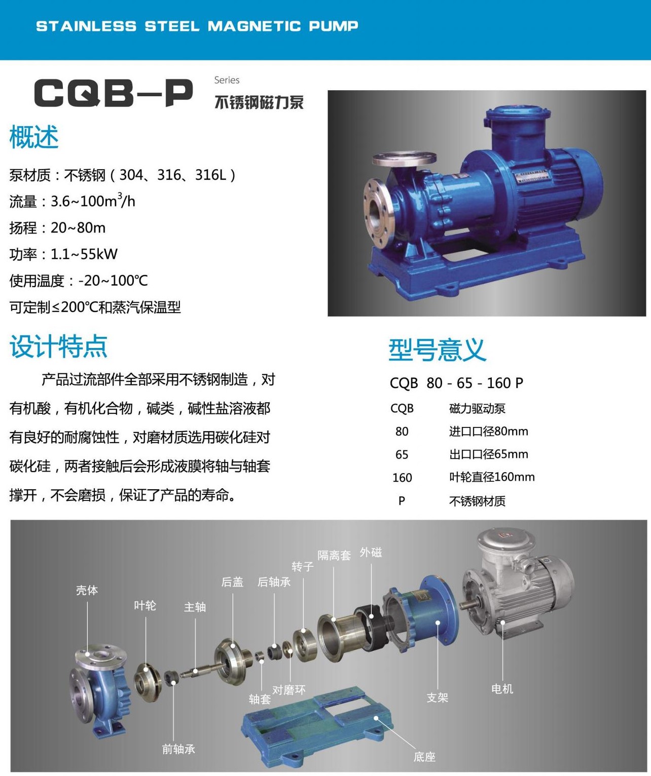 4、CQB-P型不銹鋼高溫磁力泵流量范圍:3.6-100T/ h。 揚程范圍:15-80m 。 適用介質:堿液、有機溶劑、醫(yī)藥中間體等。 特點:超長壽命,免維護。 可以針對不同工況條件,訂制特殊的配置。