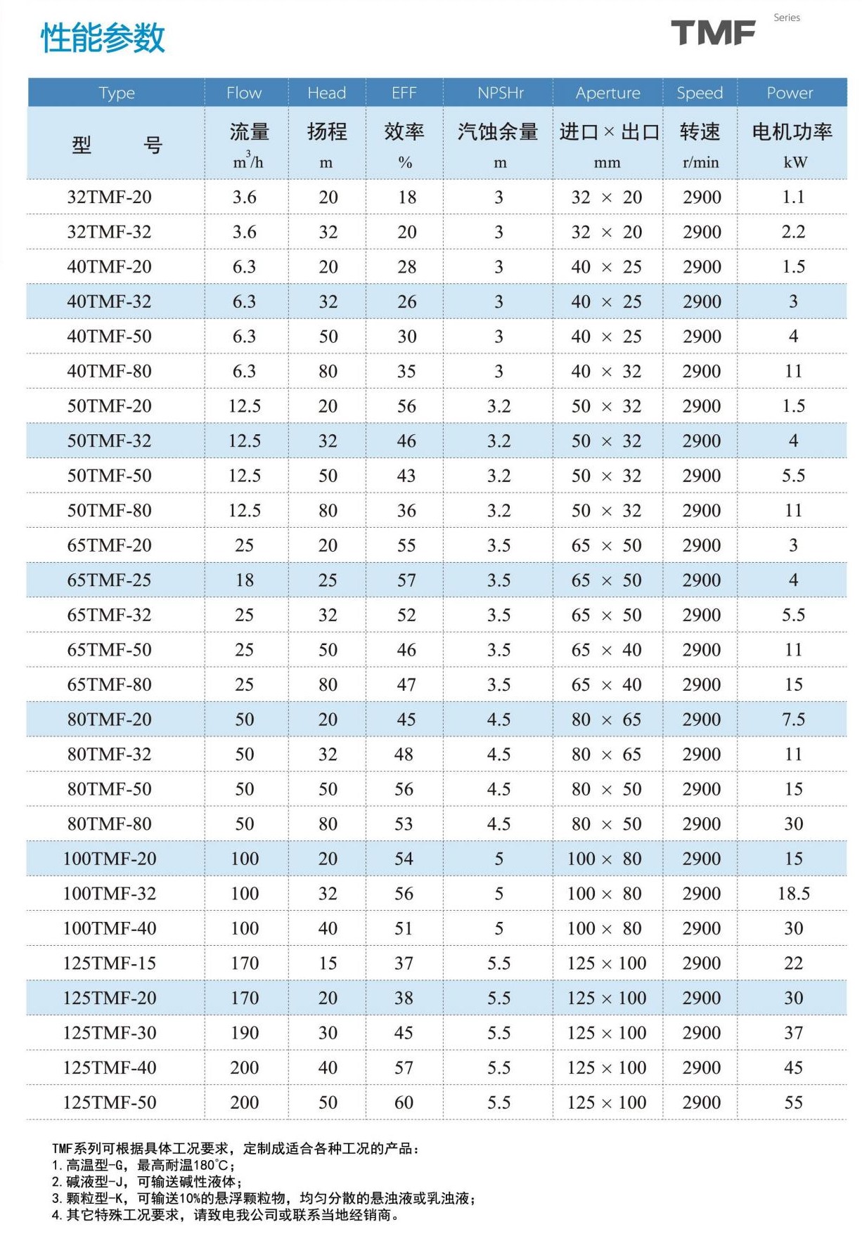 4、TMF型直聯(lián)式襯氟磁力泵:運用領(lǐng)域:氯堿、電子、酸洗、醫(yī)藥、農(nóng)藥、造紙、冶金等。適用介質(zhì):高濃度的酸、堿、鹽、有機溶劑等。流量范圍:3.6m3/h-200m3/h,揚程范圍:20m-80m,功率范圍:1.1kw-55kw。運行溫度:-20℃—150℃?筛鶕(jù)實際工況要求變更配置。